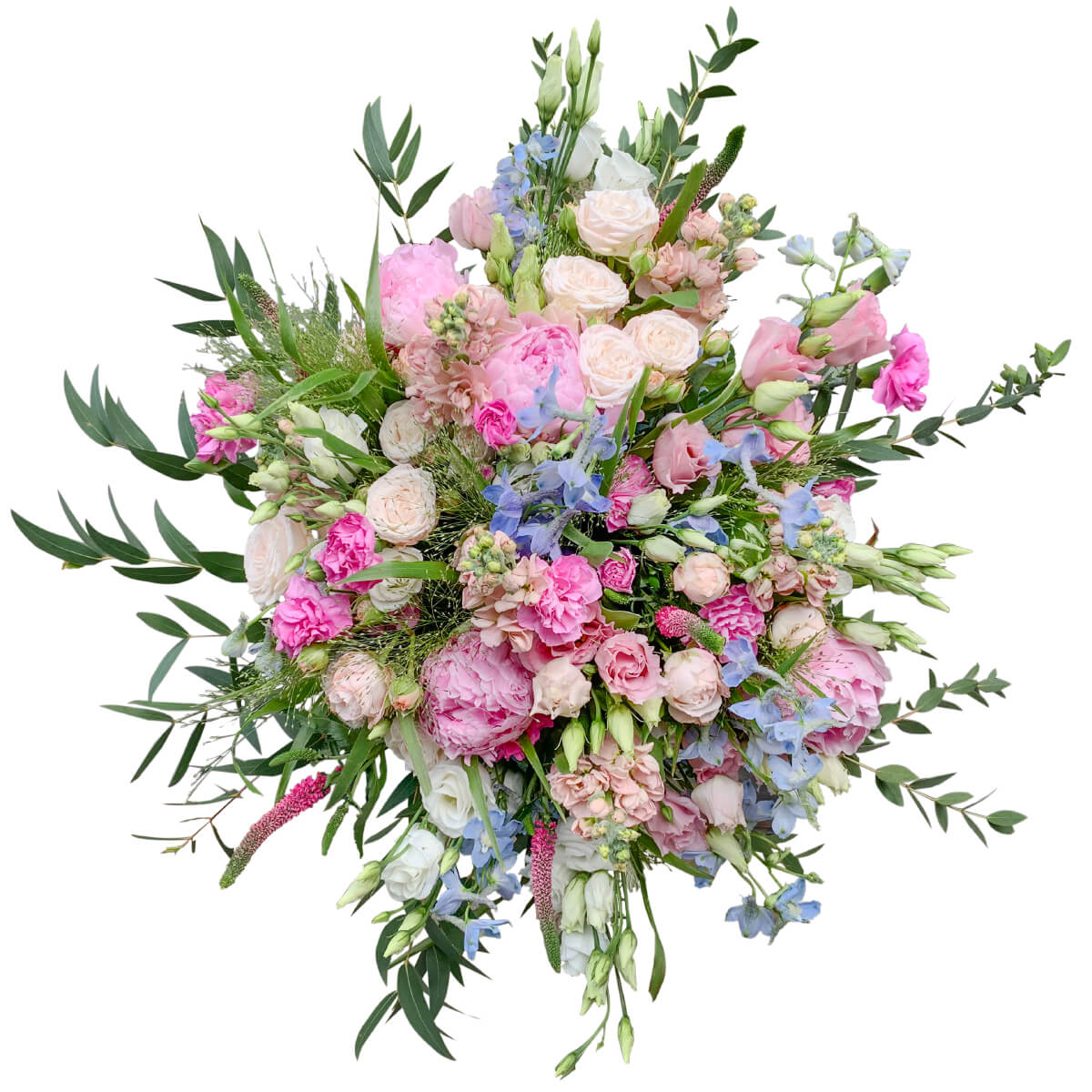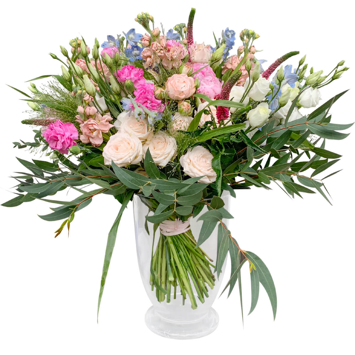 Ten niecodzienny bukiet idealny będzie by spełnić te najskrytsze marzenie. Bukiet z sezonowych różowych i niebieskich kwiatów. Na zdjęciu letnia kompozycja. Zimowa, wiosenna czy jesienna kompozycja również zachwyci swym pięknem nie jedna kobietę. Do bukietu możesz dołączyć bilecik, aby przekazać życzenia.