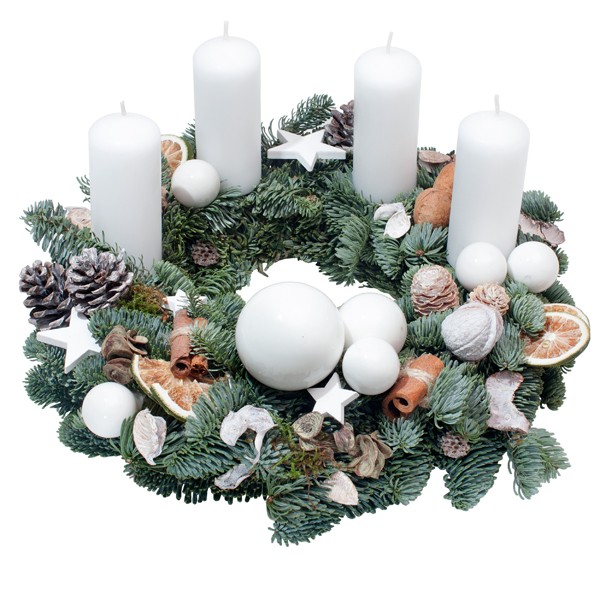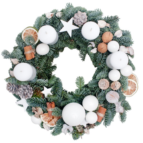 To piękny prezent, który wniesie dużo zapachu i świątecznego nastroju do domu i biura. W kolorach zielono–białych wianek z sezonowymi, naturalnymi dodatkami będzie miał niepowtarzalny charakter. Można do niego dołożyć bilecik ze świątecznymi życzeniami.