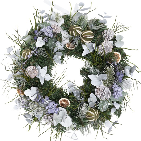 Wianek w białych i szarych kolorach to bardzo elegancki świąteczny prezent. Bogato zdobiony ze sztucznego świerku z naturalnymi owocami i stabilizowanymi gałązkami eukaliptusa.Wianek ma średnicę 50 cm i może być ozdobą drzwi, ściany lub okna.