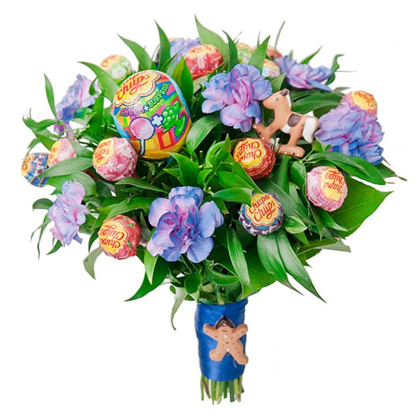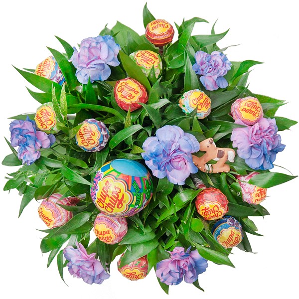 „Chupa surprise dla chłopaka” Wesoły bukiet z zielonych liści, niebieskich goździków, lizaków chupa chups i niespodzianki.Do bukietu możesz dołączyć kolorowy bilecik i przekazać życzenia.