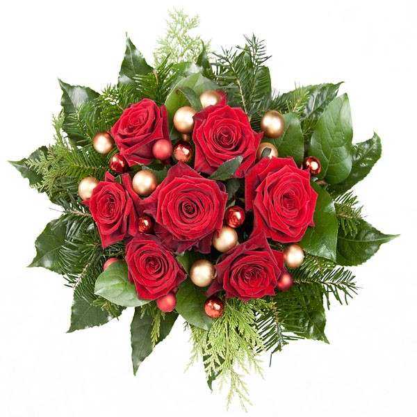Złóż Noworoczne Życzenia w wyjątkowej kwiatowej oprawie. Bukiet ten będzie wspaniałą ozdobą. Czerwone róże, pachnące gałązki zielonej jodły, złote i czerwone bombki, całość związana piękną złotą wstążką. Wspaniały prezent aby złożyć życzenia…