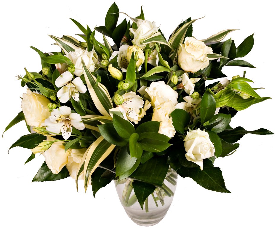 Wspaniałe róże, eustomy, alstreomerie oraz kwiaty sezonowe uzupełniają zielone i biało-zielone liście.