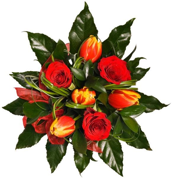 Płomienny, pełen ekspresji bukiet. Intensywne barwy odzwierciedlają uczucia ,które możesz wyrazić za pomocą kwiatów. Pięknie ułożone czerwone róże z tulipanami lub gerberami zależnie od pory roku.