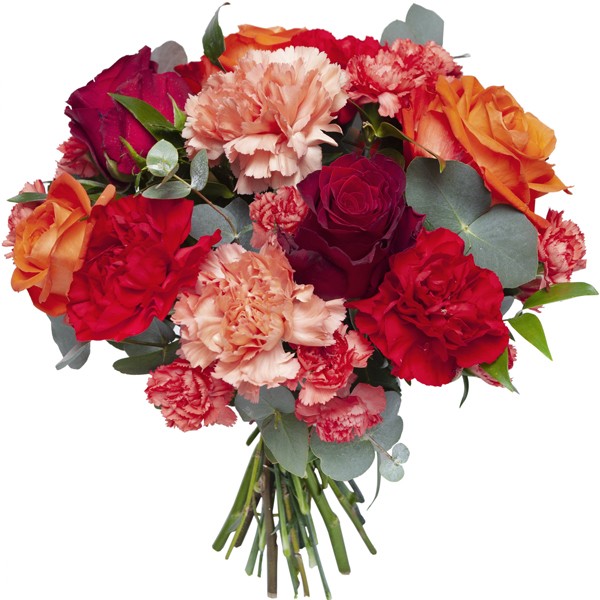 Moc życzeń w kwiatowej, energetycznej oprawie.Ten ułożony na okrągło bukiet składa się z herbacianych i czerwonych róż, goździków w ciepłych tonacjach i sezonowego przybrania. Do bukietu gratis można dołączyć bilecik, aby przekazać życzenia.