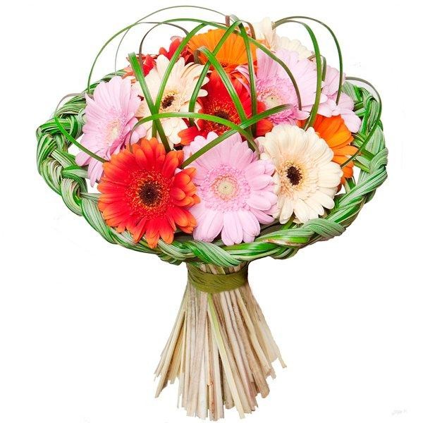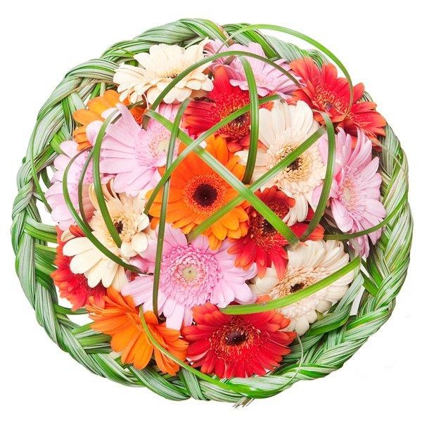 Piękny bukiet świeżych gerber ułożony artystycznie na okrągło, ozdobiony wspaniale zaplecionym warkoczem z traw! Do bukietu dołączymy bilecik z Twoimi życzeniami.