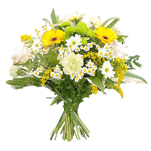 Kwiaty użyte do wykonania bukietu są połączeniem róż, goździków, margaretek oraz kwiatów sezonowych w ciepłej zielono-żółtej tonacji. Bukiet uzupełniają polne kwiaty oraz trawy, razem tworząc niepowtarzalną kompozycję, ponieważ firmuje go florysta wkładając w jego stworzenie swoją inwencję i emocje.