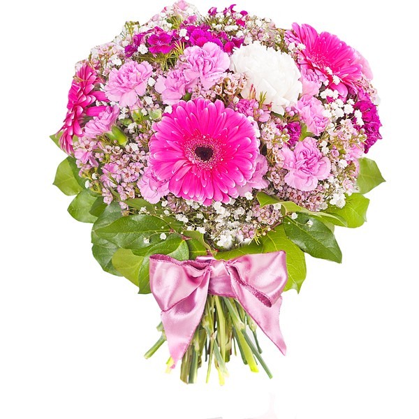 Bukiet „Dla Mamy” Bukiet w tonacji różowej ułożony jest z gerber, goździków, róż ,gipsówki i pachnących kwiatów letnich. Kompozycja związana jest piękną atłasową wstążką. Do bukietu dołączony jest bilecik aby przekazać życzenia.