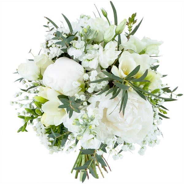 Bukiet, Ślubny biały z eukaliptusem’ Wyślij jako prezent Młodej Parze lub zamów dla przyszłej Panny Młodej. Delikatny, pachnący bukiet z białych kwiatów sezonowych z dodatkiem eukaliptusa. Klasa sama w sobie. Do prezentu możesz dołączyć gratis kartke ślubną z życzeniami.’
