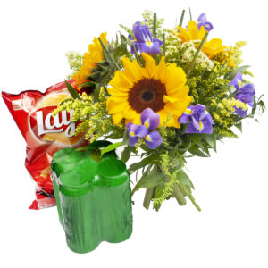 Słoneczniki i irysy w w letnim przybraniu z kilku gatunków traw to uniwersalny pomysł na poprawę nastroju. Żółty słoneczny kolor dodaje energii. Do każdego bukietu jest dołączony 4’ro pak piwa bezalkoholowego oraz paczka chipsów. Dodatkowo do naszego bukietu mogą Państwo dołączyć bilecik z życzeniami.