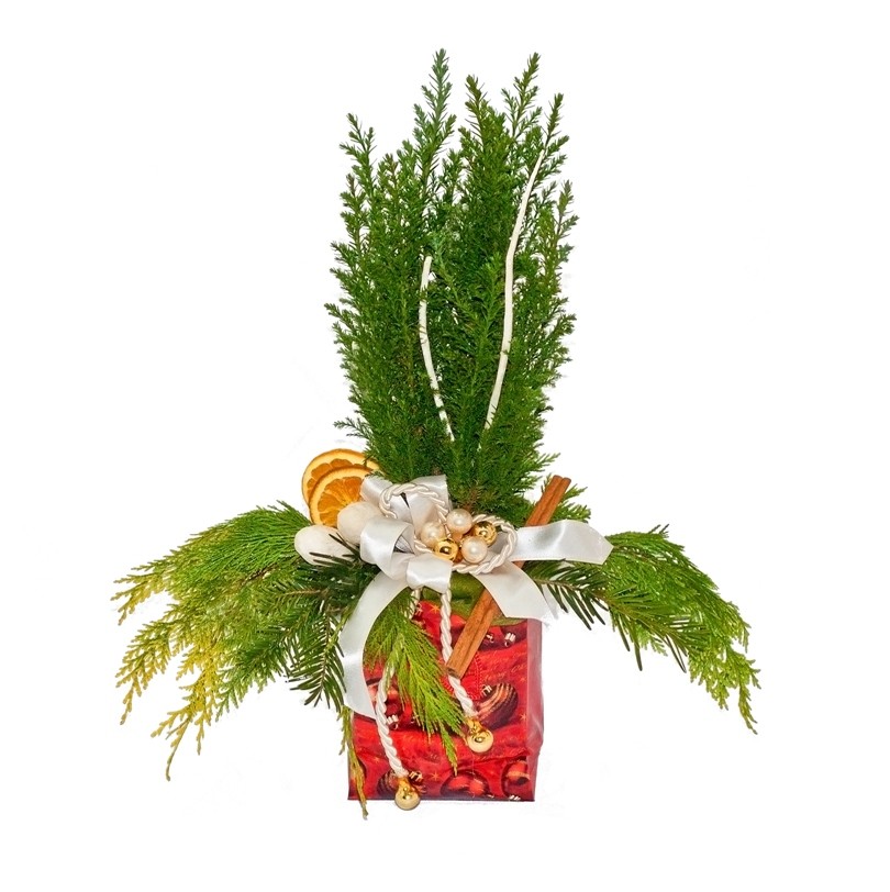 Cyprysik – świeże, pachnące drzewko! Cyprysik, jako prezent został opakowany w świąteczną torebkę, w której znajduje sie osłona doniczki i podstawek aby drzewko mozna bylo podlewać. Wyślij pachnącego świętami cyprysika, będzie on dekoracją nie tylko biurka. Do prezentu możesz dołączyć świąteczny bilecik z życzeniami.