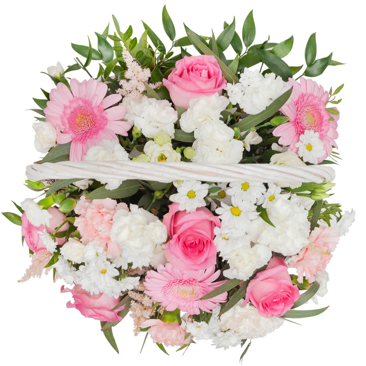 Kompozycja Delikatny kosz to subtelne połączenie sezonowych kwiatów, w różowo-białej tonacji. Wyraź swoje uczucia w finezyjny, a zarazem niebanalny sposób razem z Nami. Spraw by Twoje wybranka poczuła się kochana, doceń jej piękno i podaruj jej kosz kwiatów.