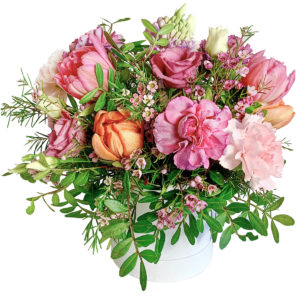 Piękna kompozycja z różowych kwiatów w białym luksusowym, okrągłym pudełku. Doskonały prezent do wysłania. W pudełku jest plastikowy pojemnik z gąbką florystyczną w, której kwiaty długo stoją. Przesyłka robi ogromne wrażenie. Do przesyłki możesz dołączyć bilecik z życzeniami.