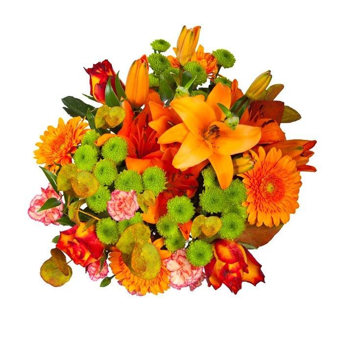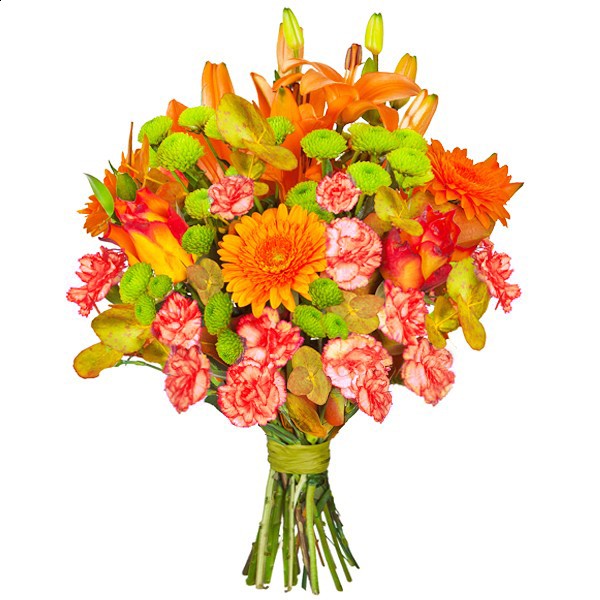 ,,Kolory jesieni” Tylko w kwiaciarni On Line znajdziesz tak pełen pozytywnej energii jesienny bukiet! Pokoloruj więc wybranej osobie szary dzień na pomarańczowo 🙂 Ten ułożony na okrągło bukiet składa się z pomarańczowych lilii, herbacianych róż, gerber, goździków i sezonowych jesiennych dodatków. Do bukietu możesz dołączyć bilecik z życzeniami.