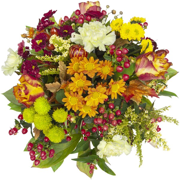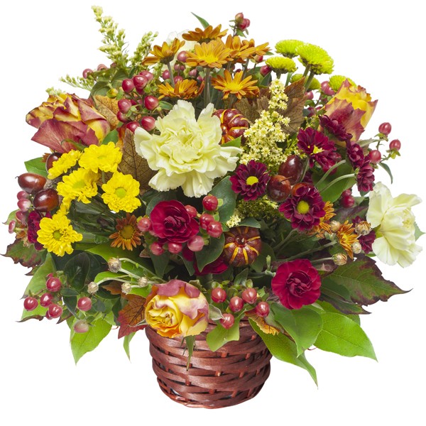 W wiklinowym koszu jest plastikowy pojemnik. Aby obdarowana osoba długo cieszyła się kwiatami w gąbce florystycznej ułożyliśmy piękny jesienny bukiet z owocami , imitacją natury’. Wysokość kompozycji z koszem 40 cm.Jesienny bilecik dołączymy gratis.