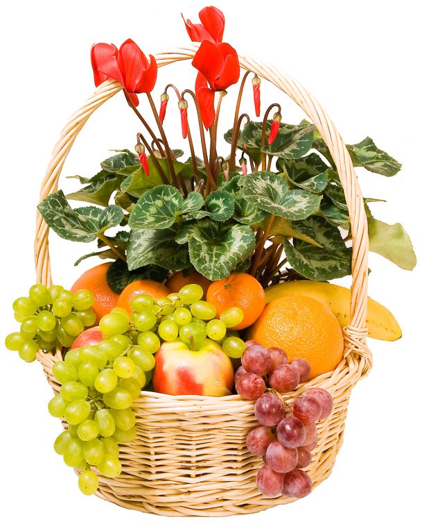 Wszystkie owoce swieże i pachnące w najlepszym wyborze. Kosz uzupełnia piękny kwiat doniczkowy Cyklamen, obsypany mnóstwem czerwonych kwiatów. Zaskocz bliską osobę wspaniałą przesyłką…niech poczuje, że o niej pamietasz.