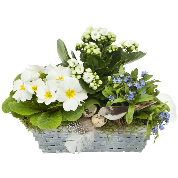 Wyślij piękny wielkanocny prezent,osoby obdarowane będą zachwycone. Szary koszyk z wiosennymi kwiatami będzie ozdobą każdego wnętrza. Koszyk bedzie zapakowany w celofan z dekoracją. Do prezentu możesz dołączyć gratis wielkanocny bilecik z życzeniami.