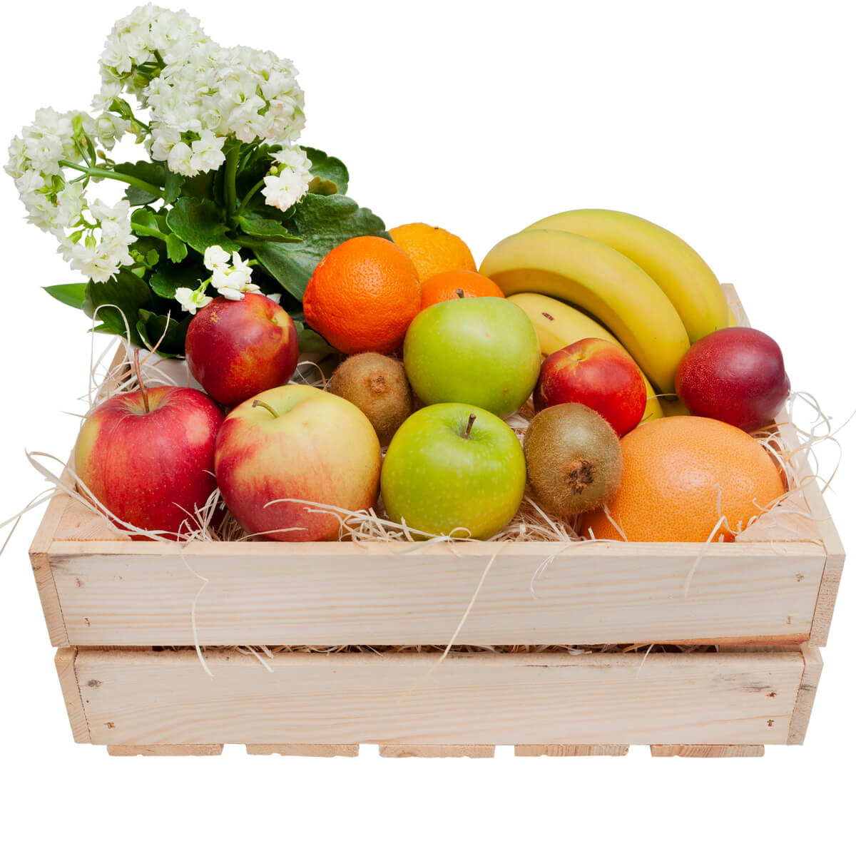 Skrzynka z owocami sezonowymi i przepięknym Kalanchoe z pewnością przyda się wszystkim w domach. W drewnianej skrzynce będzie można znaleźć owoce sezonowe w doniczkowym kwiatem.