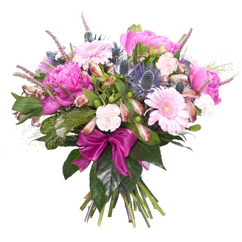 Bukiet „Różowe lato” to pachnąca wiązanka letnich kwiatów w różowych i niebieskich kolorach, jak czarodziejska łąka. Do wiązanki możemy dołączyć bilecik, aby wraz z kwiatami przekazać życzenia. *zamiast piwonii, zależnie od dostępności na rynku możemy dołączyć piękne, pachnące róże w tym samym kolorze.