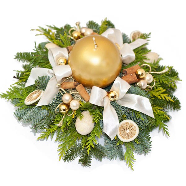 Stroik „Wesołych Świąt” w tonacji kremowo-złotej. Na szklanym podstawku w gąbce florystycznej (którą należy podlewać) został ułożony starannie stroik ze złotą kulistą świeczką. Do wykonania stroika użyto gałązek świeżej pachnącej jodły i wielu naturalnych elementów utrzymanych w tonacji kolorystycznej.