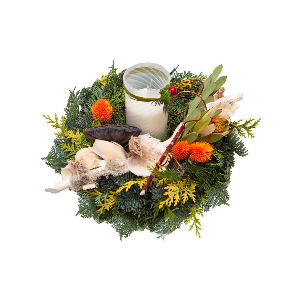 Stylowy wianek z zielonego mchu, igliwia i naturalnych dodatków, które otaczają lampion. Wyślij ten wianek aby rodzina zapaliła w Twoim imieniu światełko na grobie bliskiej osoby.