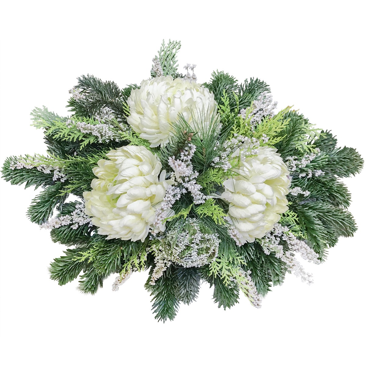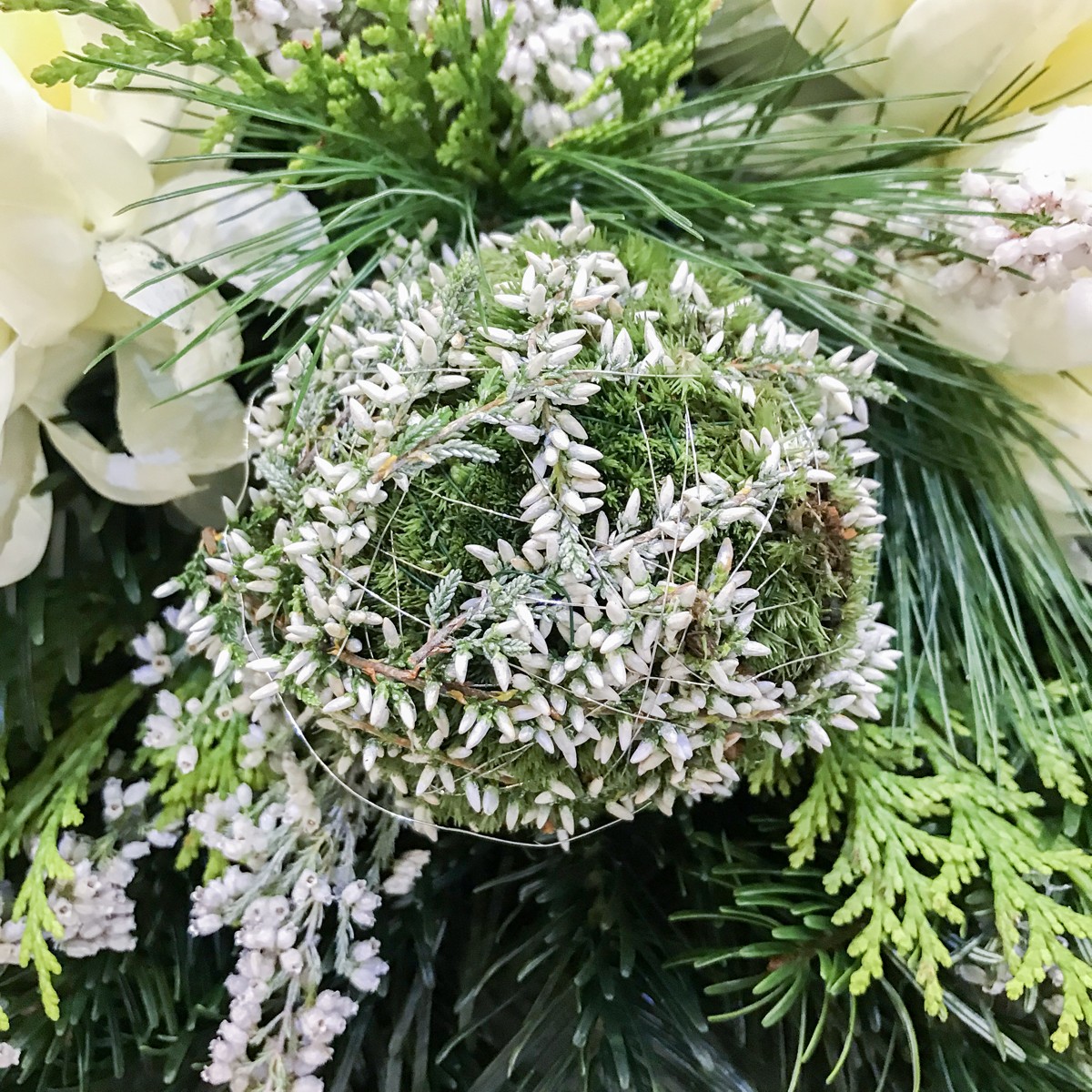 Wiązanka biała kondolencyjna „Zaduma”to wiązanka z białych chryzantem z materiału idealnie imitują żywe kwiaty,naturalnych białych wrzosów oraz gałązek jodły i cyprysika.Sprawdzi się znakomicie zarówno jako kompozycja na uroczystość Wszystkich Świętych, jak i do całorocznej dekoracji nagrobka. Istnieje możliwość dołączenia szarfy lub bileciku.