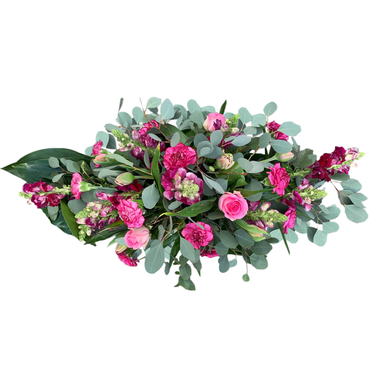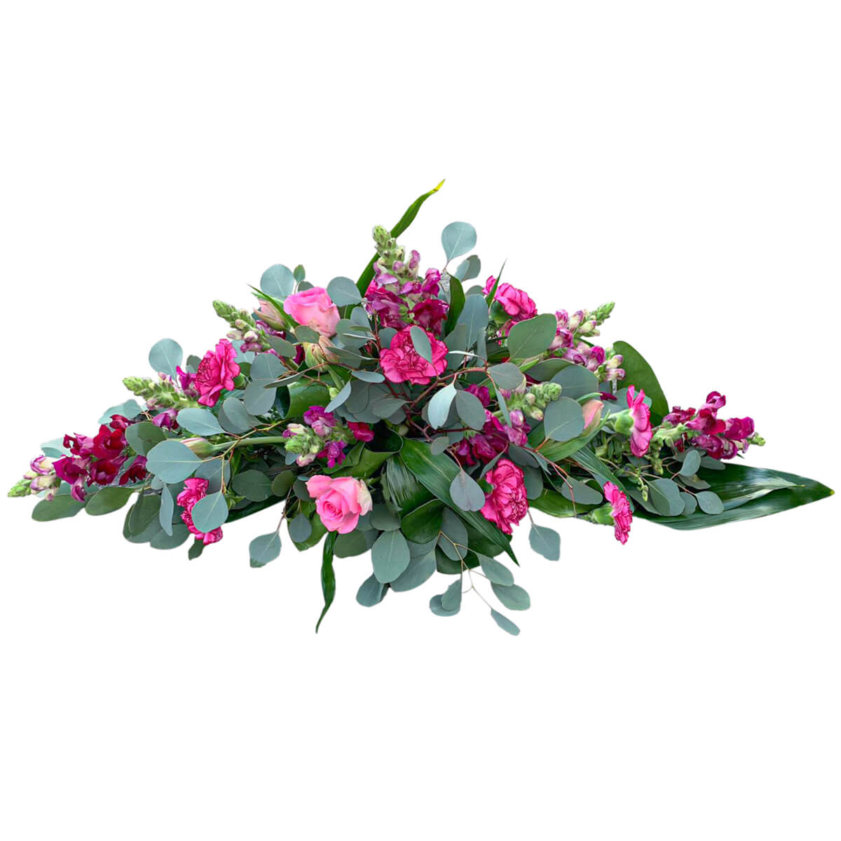 Wiązanka pogrzebowa z pięknych różowych kwiatów na zielonych żywych dodatkach. Ułożona jest w gąbce florystycznej z plastikową rączką, zapewni to długą świeżość kwiatom. Inny kolor kwiatów można uzgodnić po złożeniu zamówienia.