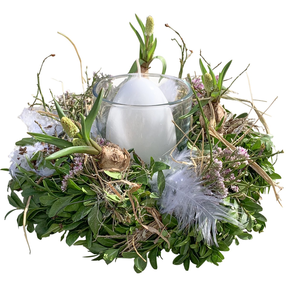Piękny, pełen żywych dodatków wiosenny stroik ze świeczką (kształt świeczki i szkło może się różnić w zależności od dostępności produktu).