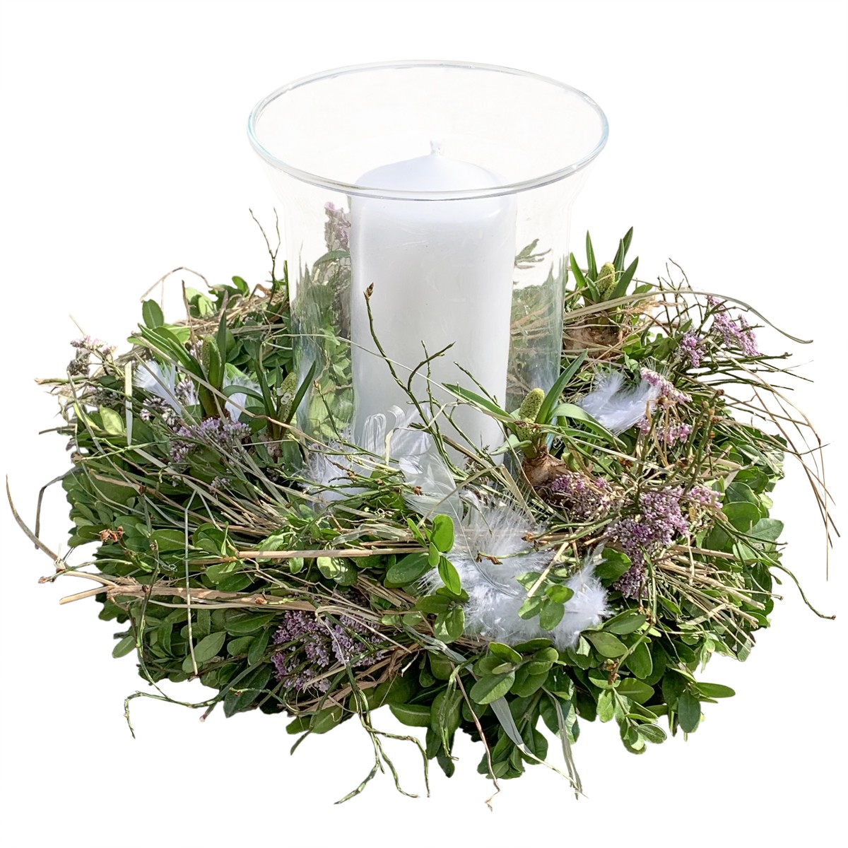 Wielkanocny stroik z  żywymi dodatkami ze świeczką (kształt świeczki i szkło może się różnić w zależności od dostępności produktu).